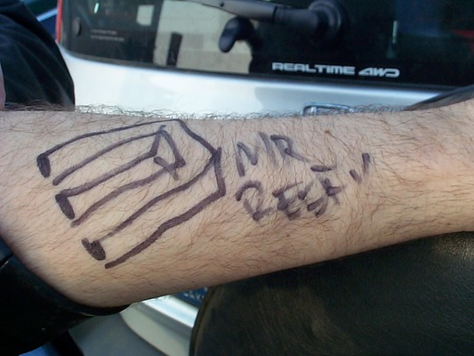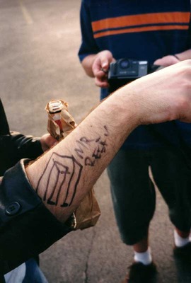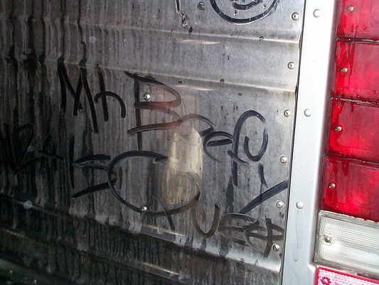 Mr. Beefy writing on the Ween tour bus |